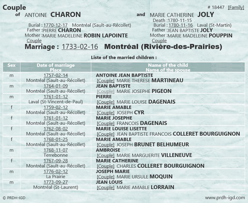 Marriage and family of Antoine Charon and Marie Catherine Joly