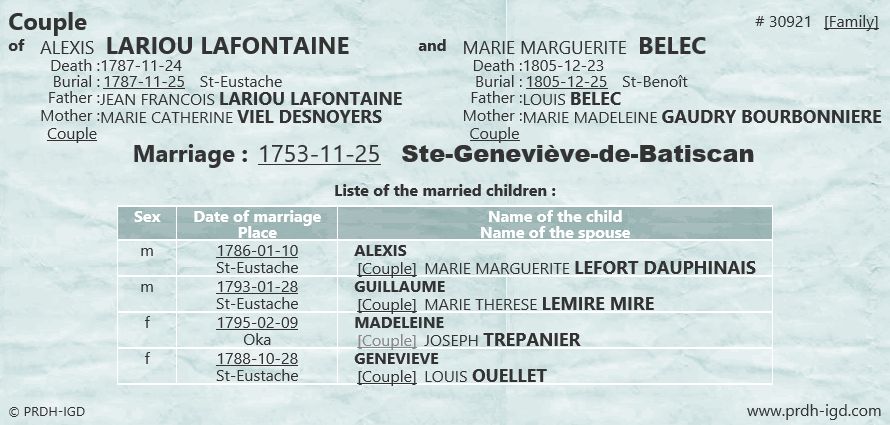 Marriage and family of Alexis Lariou and Marie Marguerite Belec