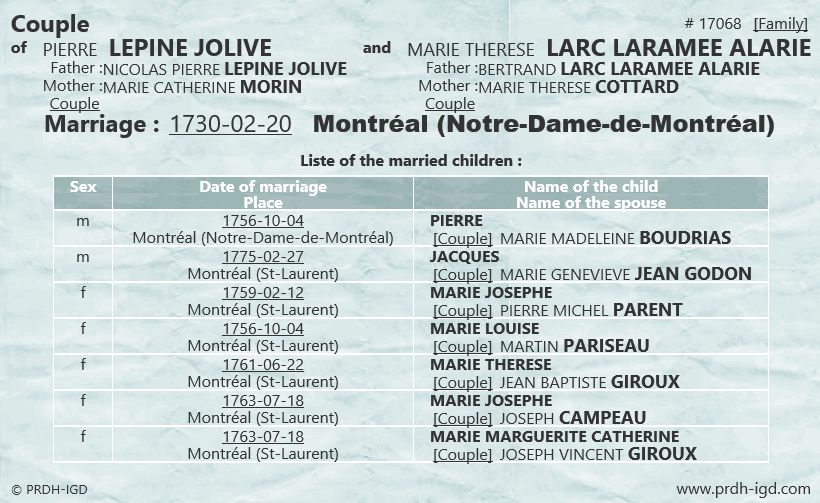 Marriage and family of Pierre Lepine and Marie Therese Larc