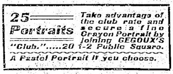 We make children's portraits a specialty. We will make a portrait of your baby for from one dollar up. Will be glad to give sittings at your home as the child is more likely to give up his best expressions. This is a new departure. Investigate. Portraits in oil and water color at Gegoux's. 20 1/2 Public Square.