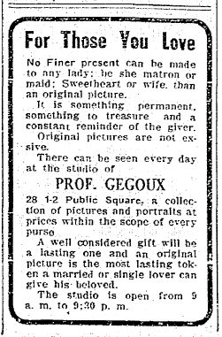 A New Way. - After months of experiments we conclude that the natural expression can be best secured by photographing the child in its own surroundings and, therefore, by appointment will come to the home of the parents who are desirous to obtain a really good photograph of the "Baby". We make baby portraits a specialty sittings given at night as well as daytime Gegoux's studio, over Express office. Public Square.