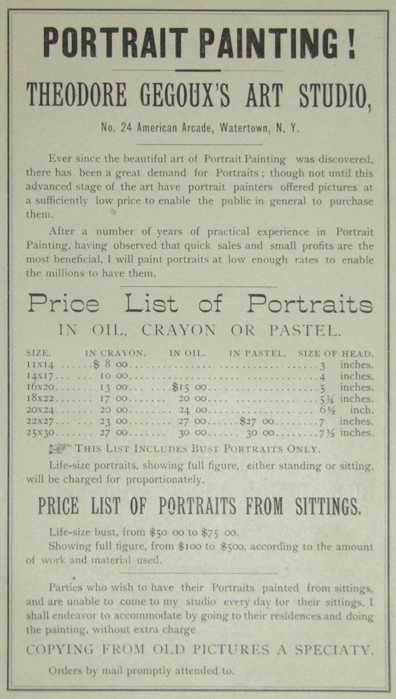" .. at the age of 23 we find Theo Gegoux the ex-bartender launching out into the art of portrait making. Having returned to Carthage N.Y., he opened a studio, and for nearly four years, continued to study portraiture in crayon, pastel and oil. But a larger field of operation was desirable and he resolved to remove his studio to Watertown, N.Y., where after two years of close attention to business, he had saved enough money to enable him to take a trip to Europe".