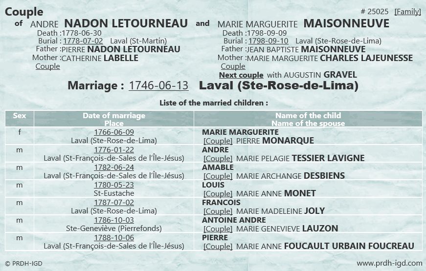 Marriage and family of Andre Nadon and Marguerite Maisonneuve
